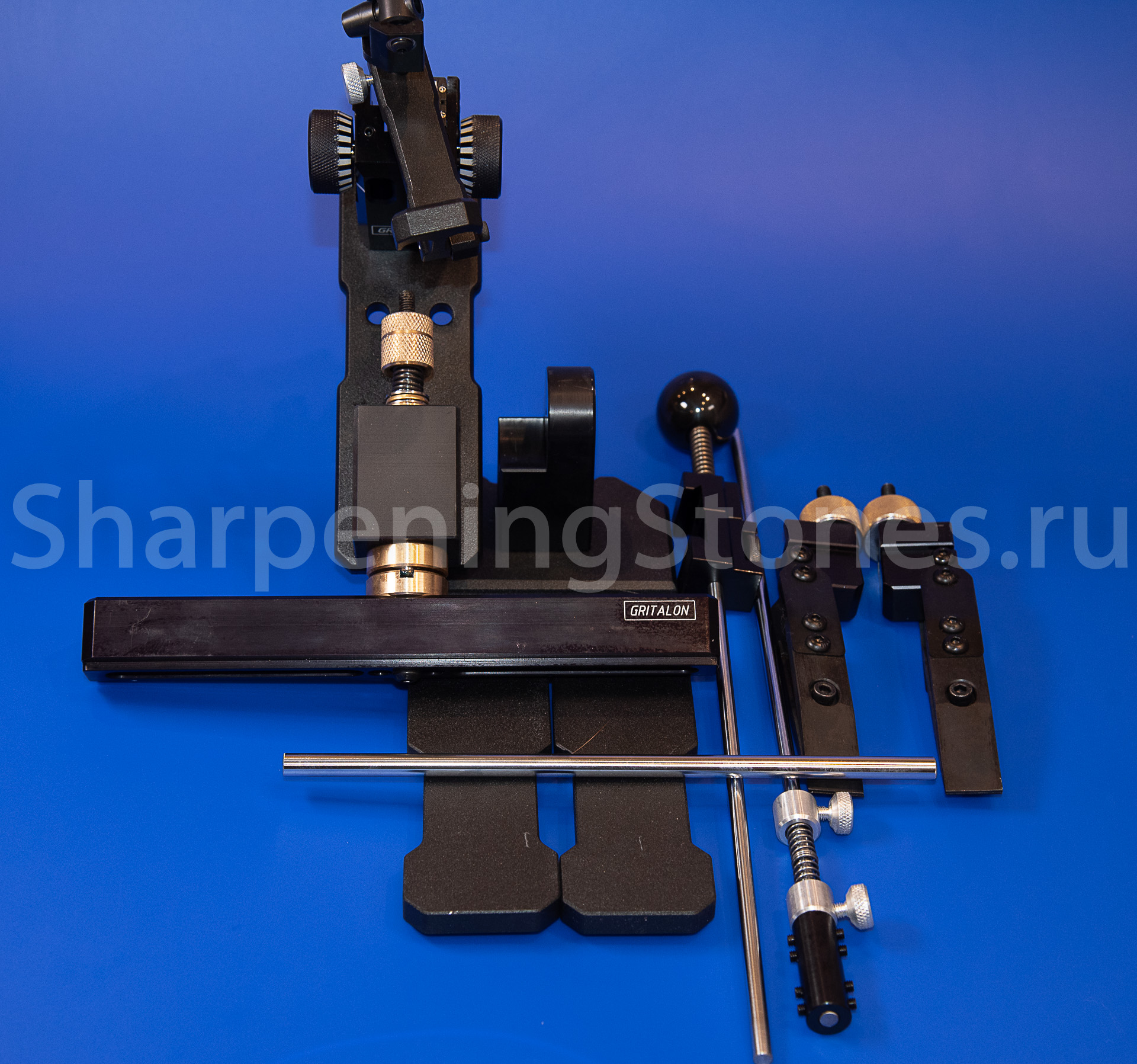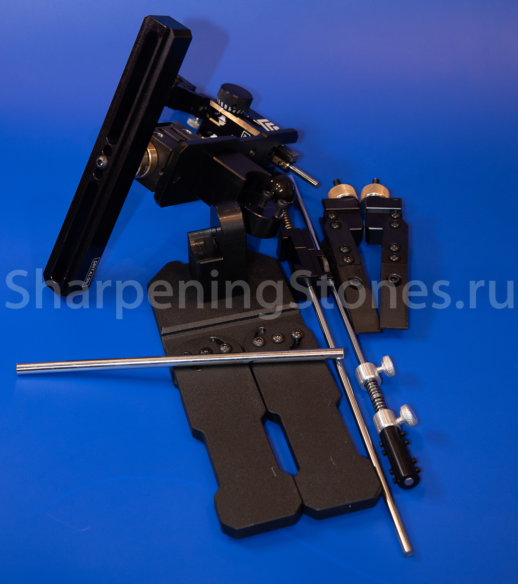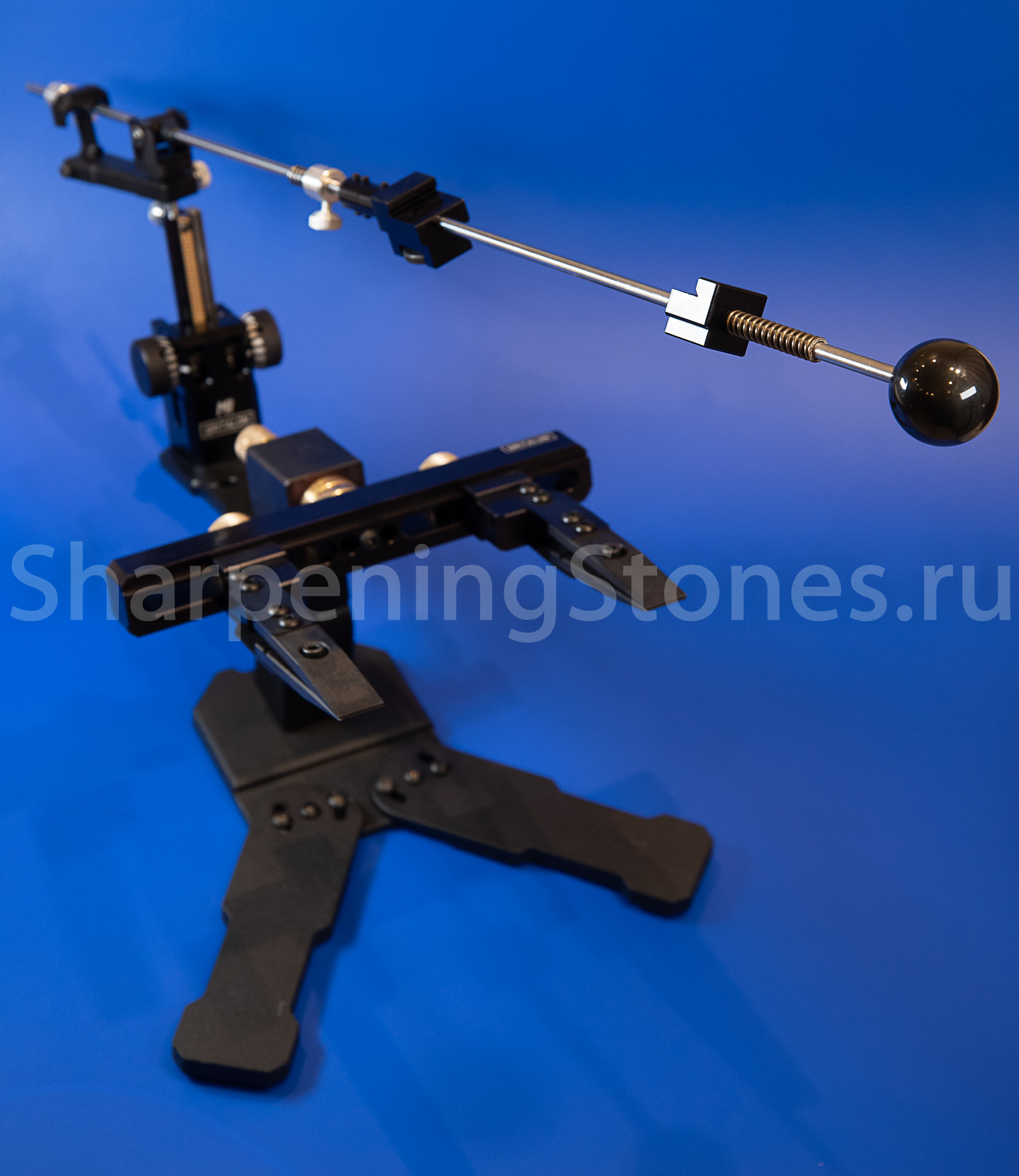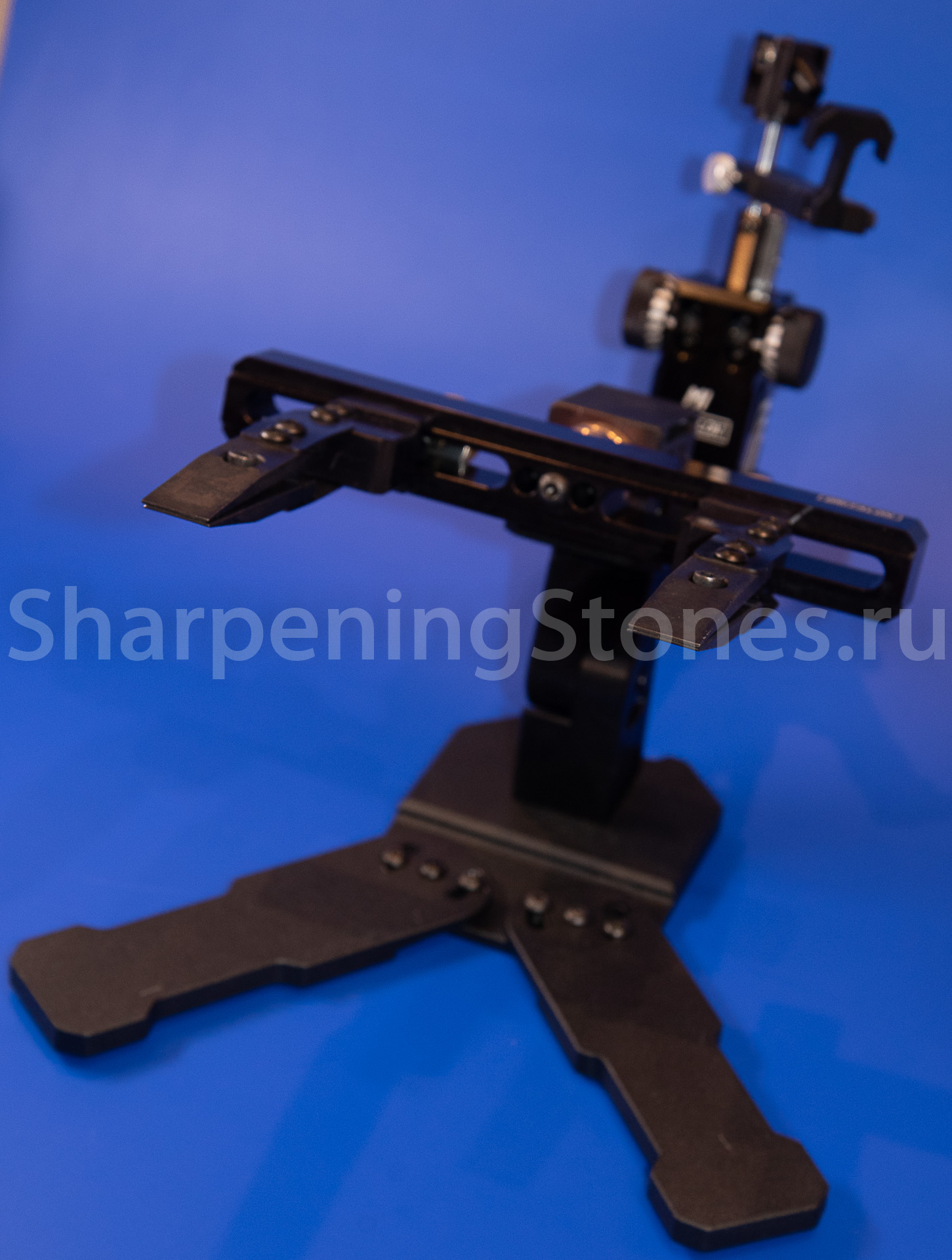 Зажим из алюминия регулируется на любой размер камней от 50 до 230 мм, жесткая пружина с большим ходом позволяет зажимать камни как на бланках, так и без них. Стойка регулировки позволяет выставить угол заточки от 10 до 30 градусов на сторону или от 20 до 60 на полный угол заточки.