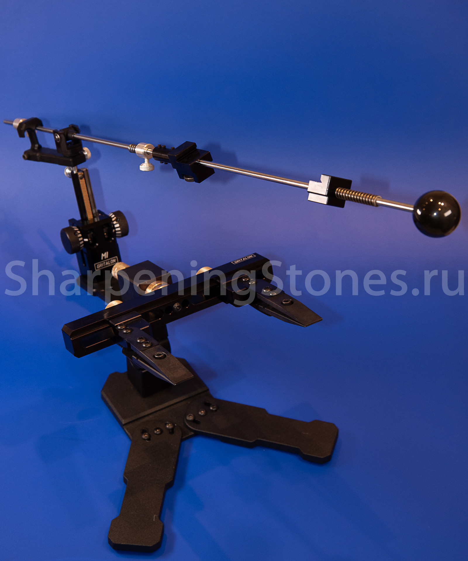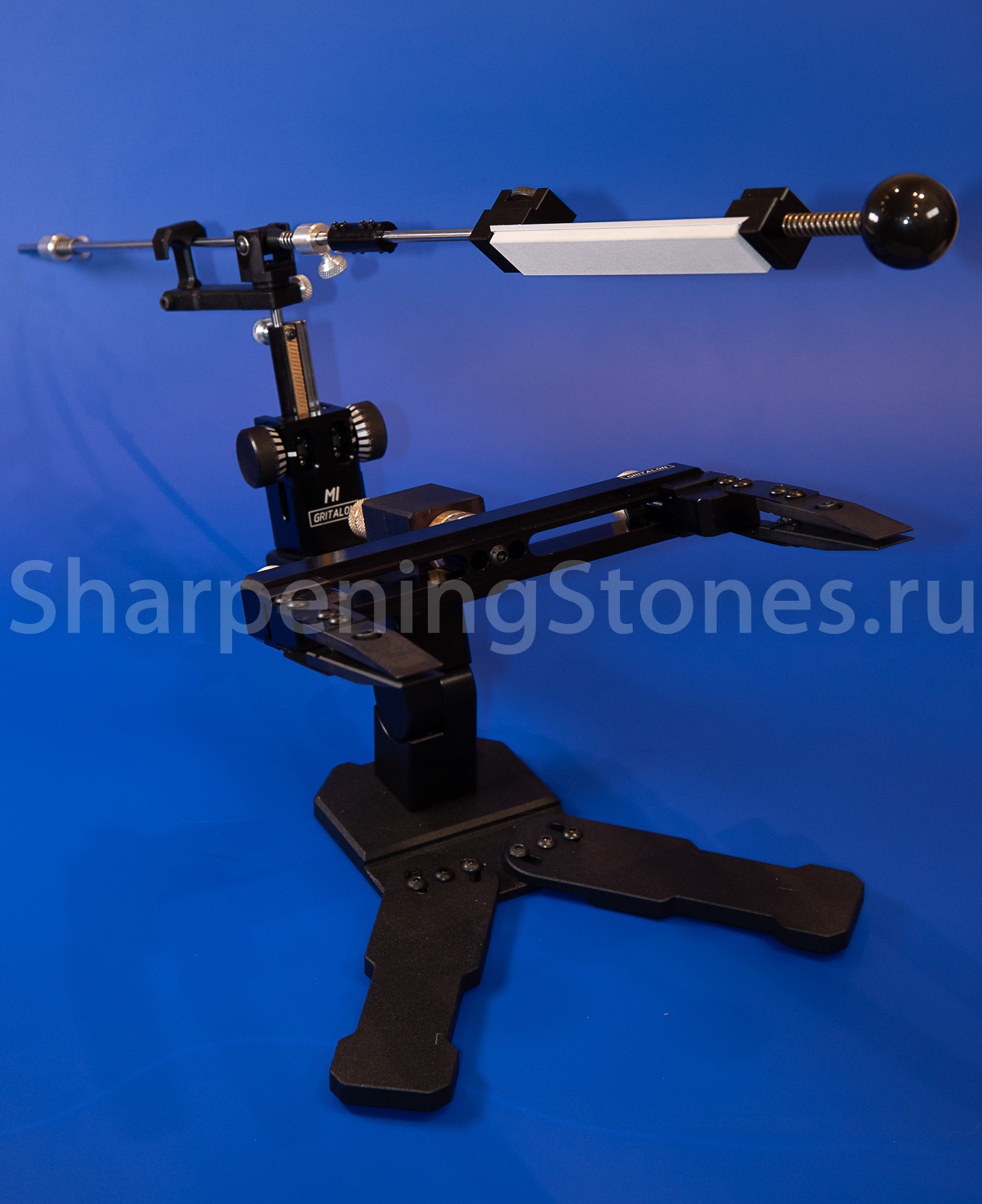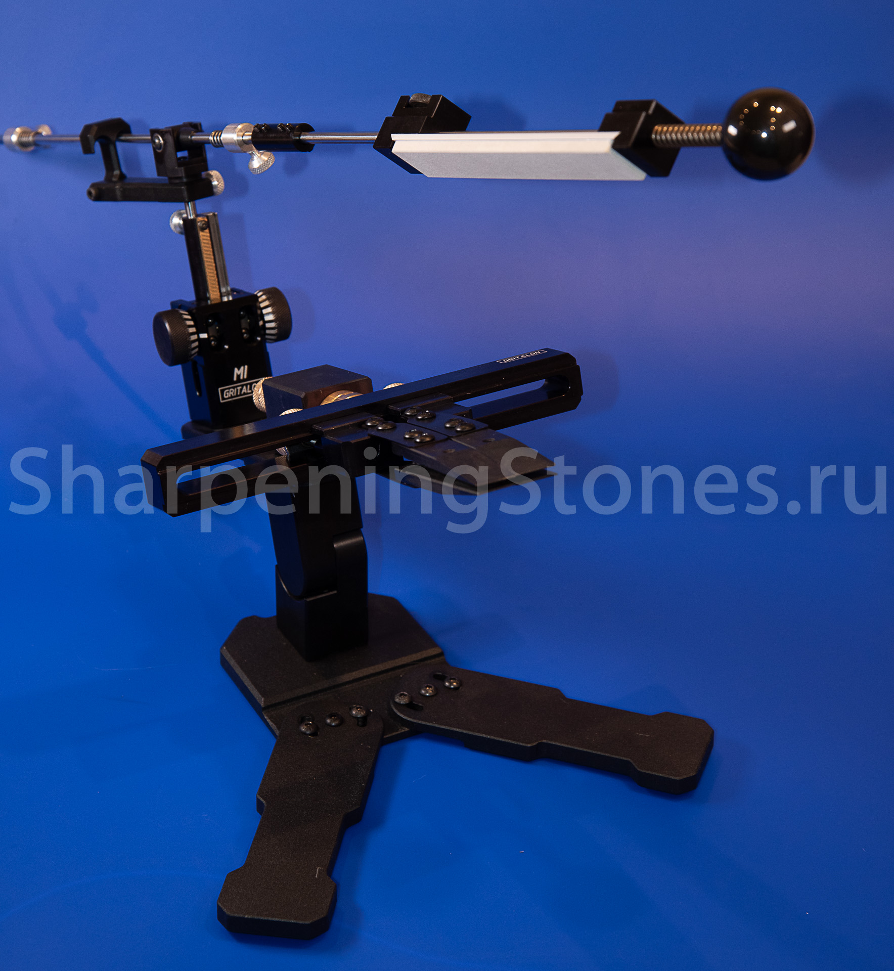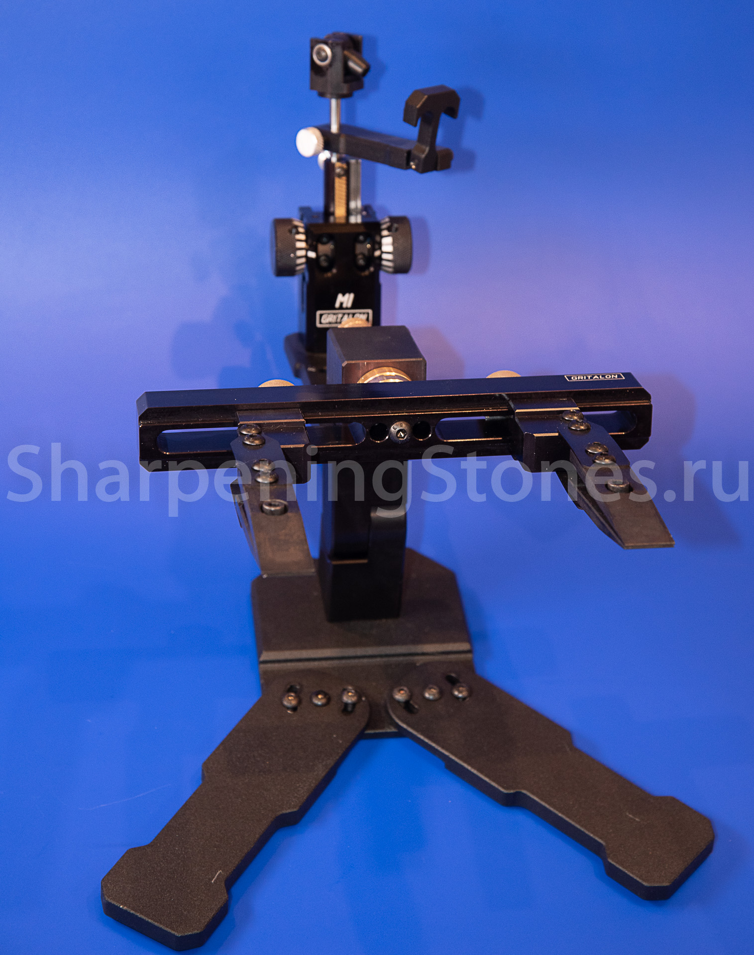 Версия GRITALON M1 с поворотным зажимом клинков, устойчивым основанием с регулировкой наклона заточного столика.