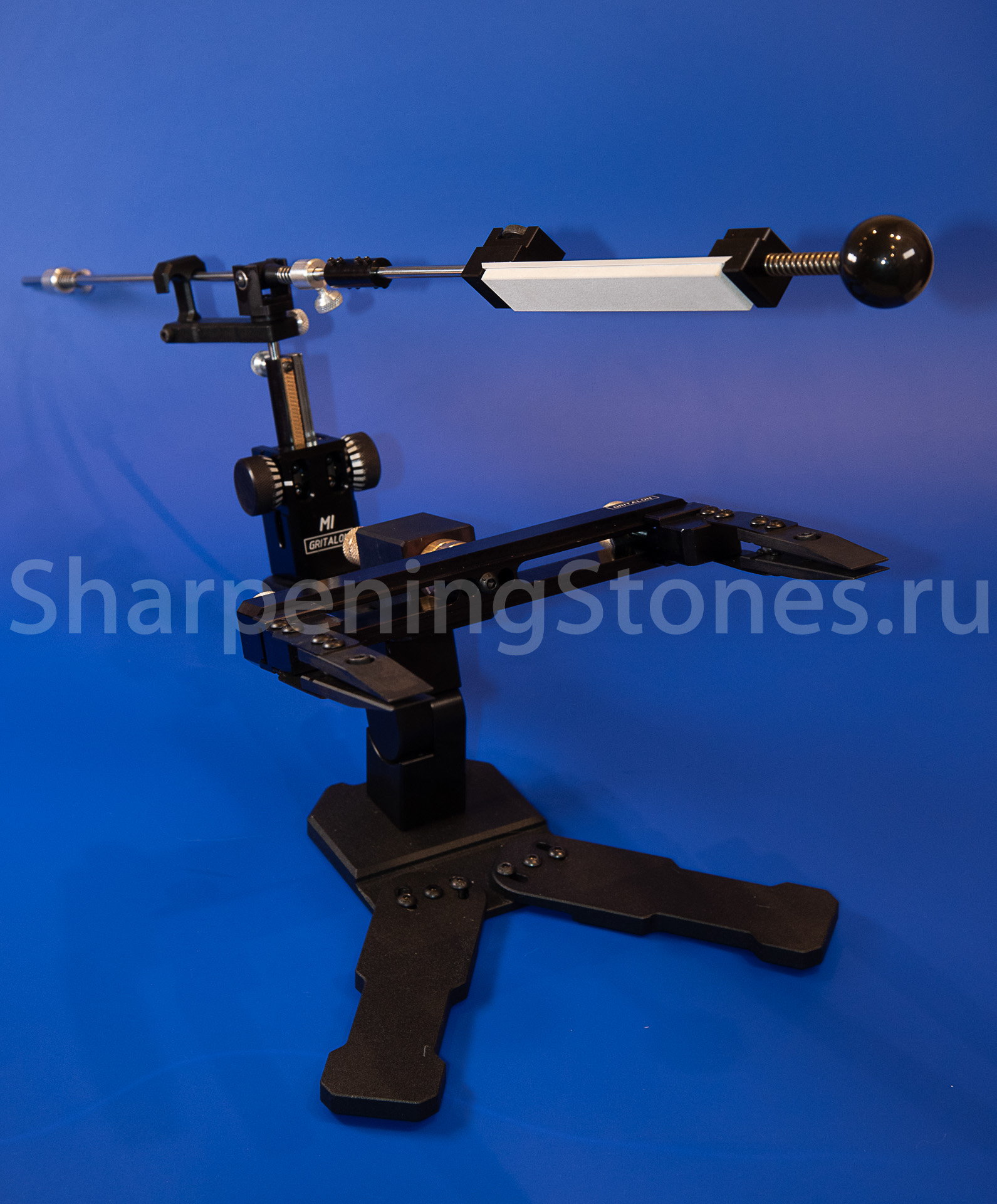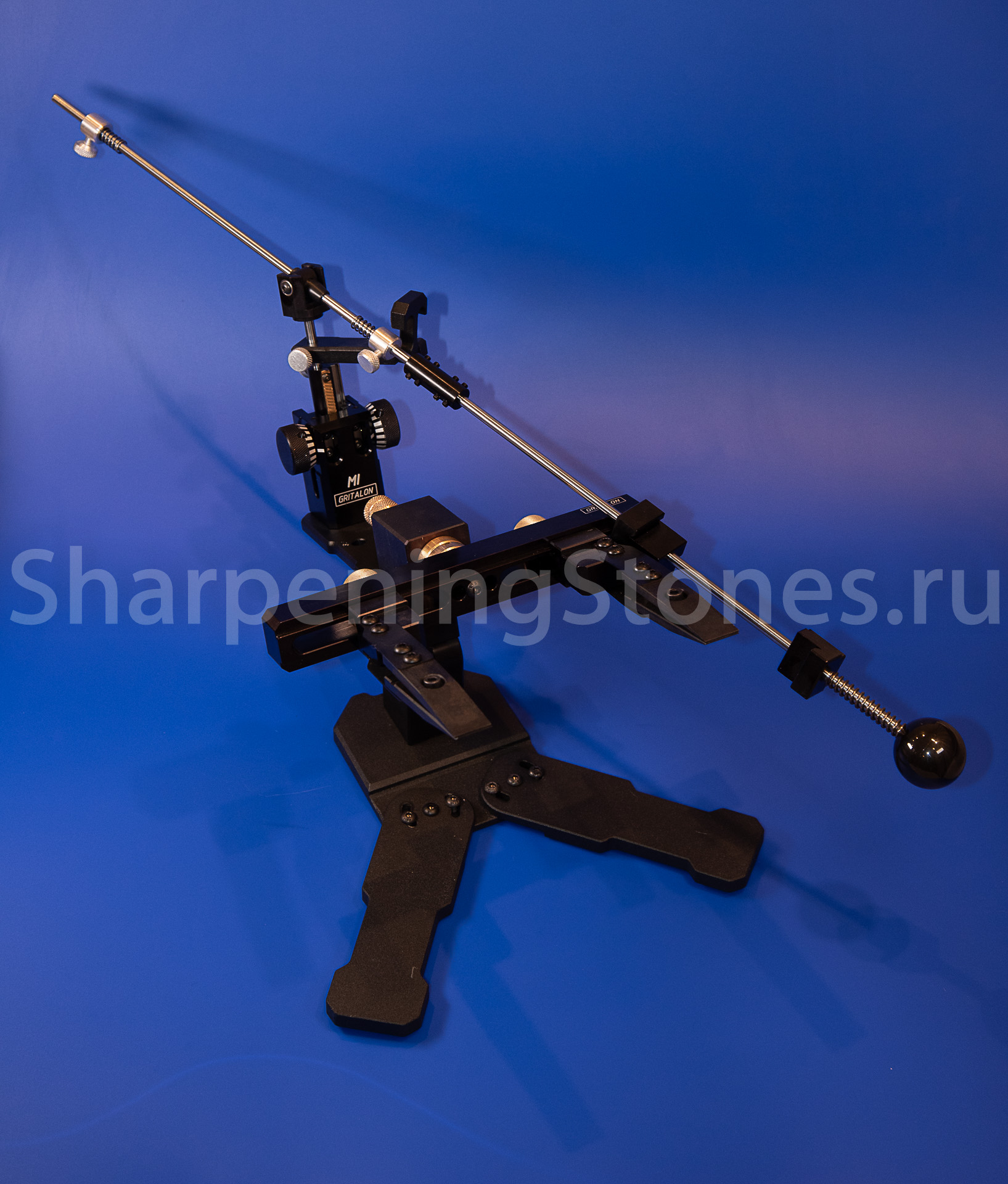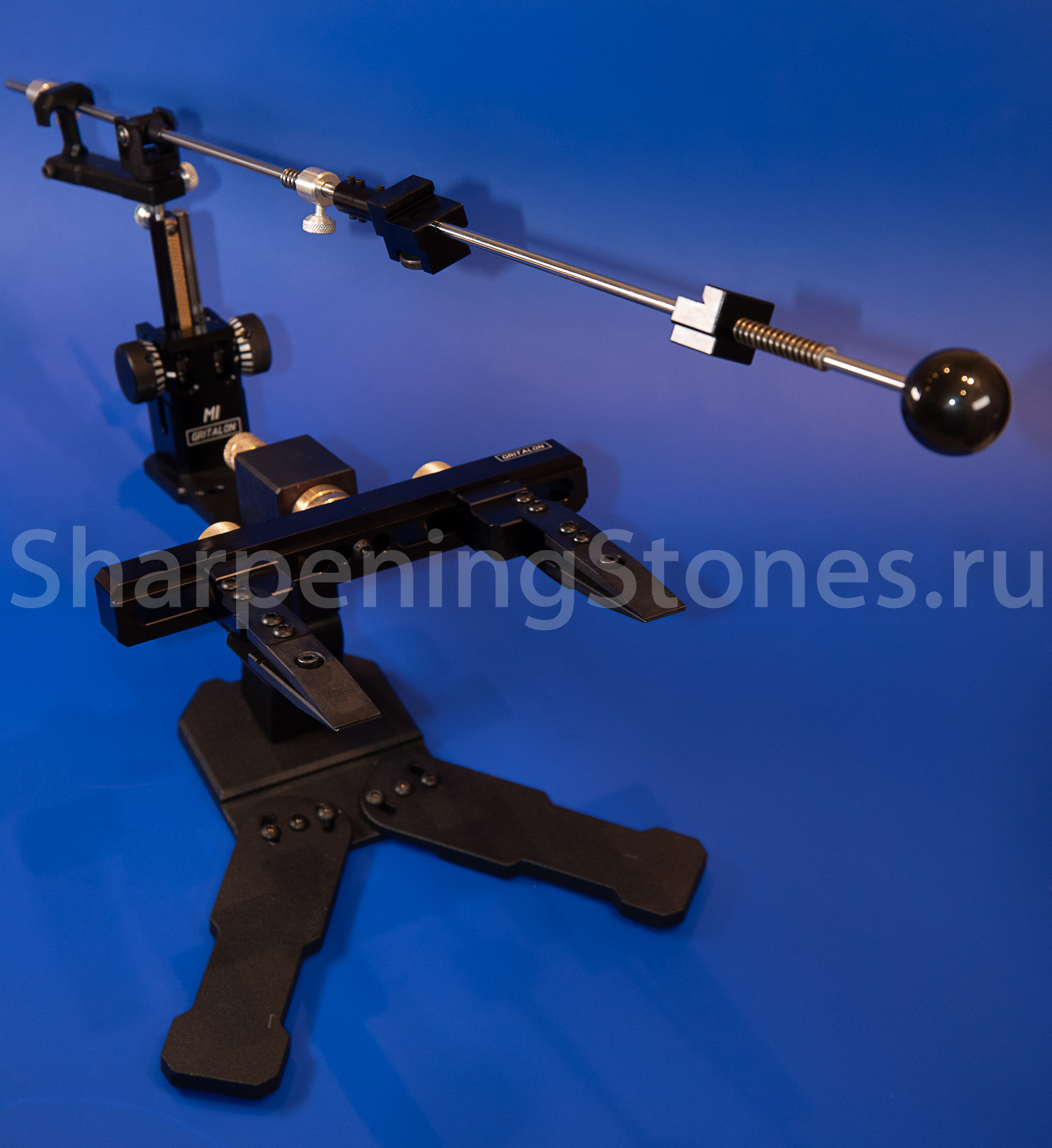 Версия GRITALON M1 с поворотным зажимом клинков, устойчивым основанием с регулировкой наклона заточного столика.