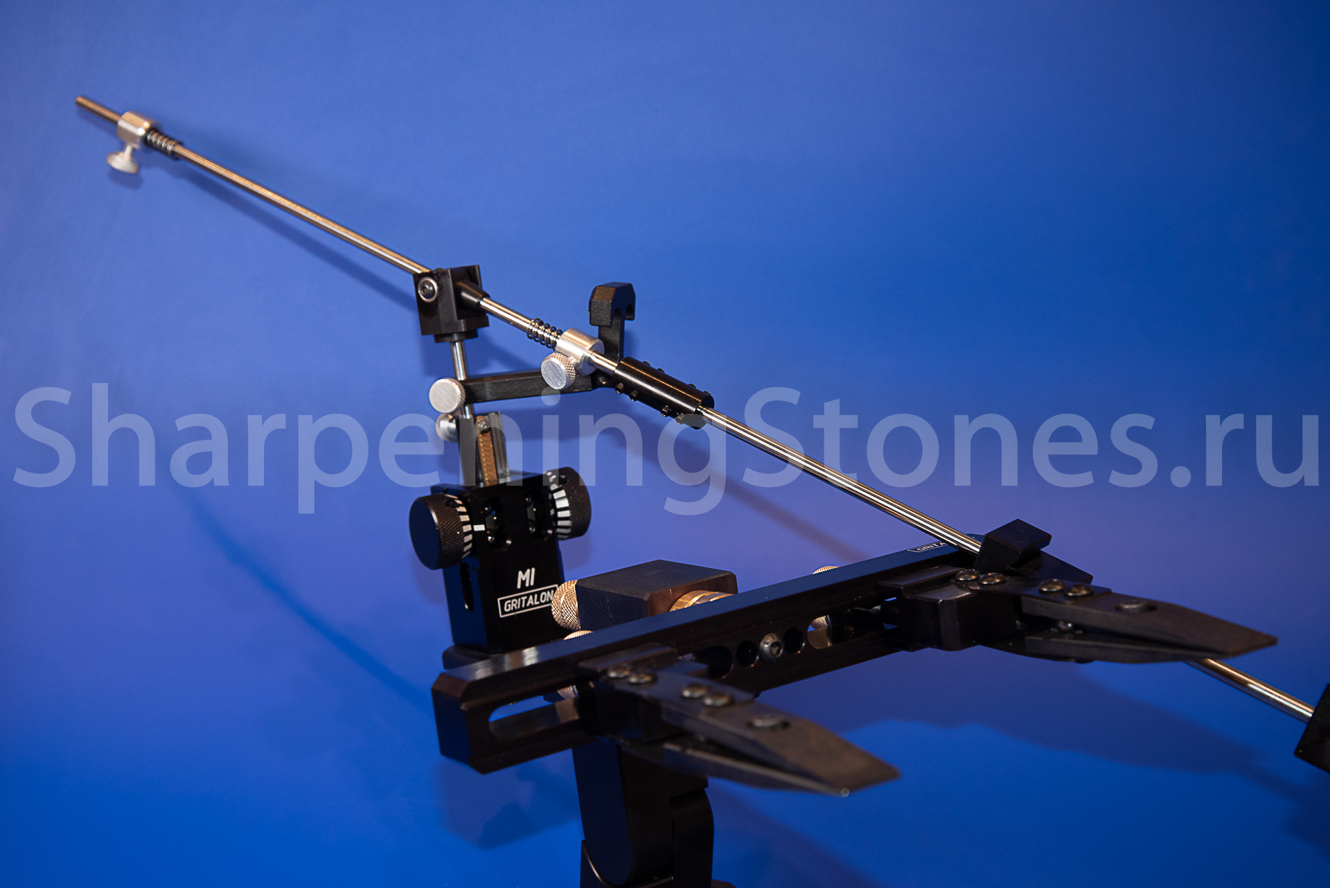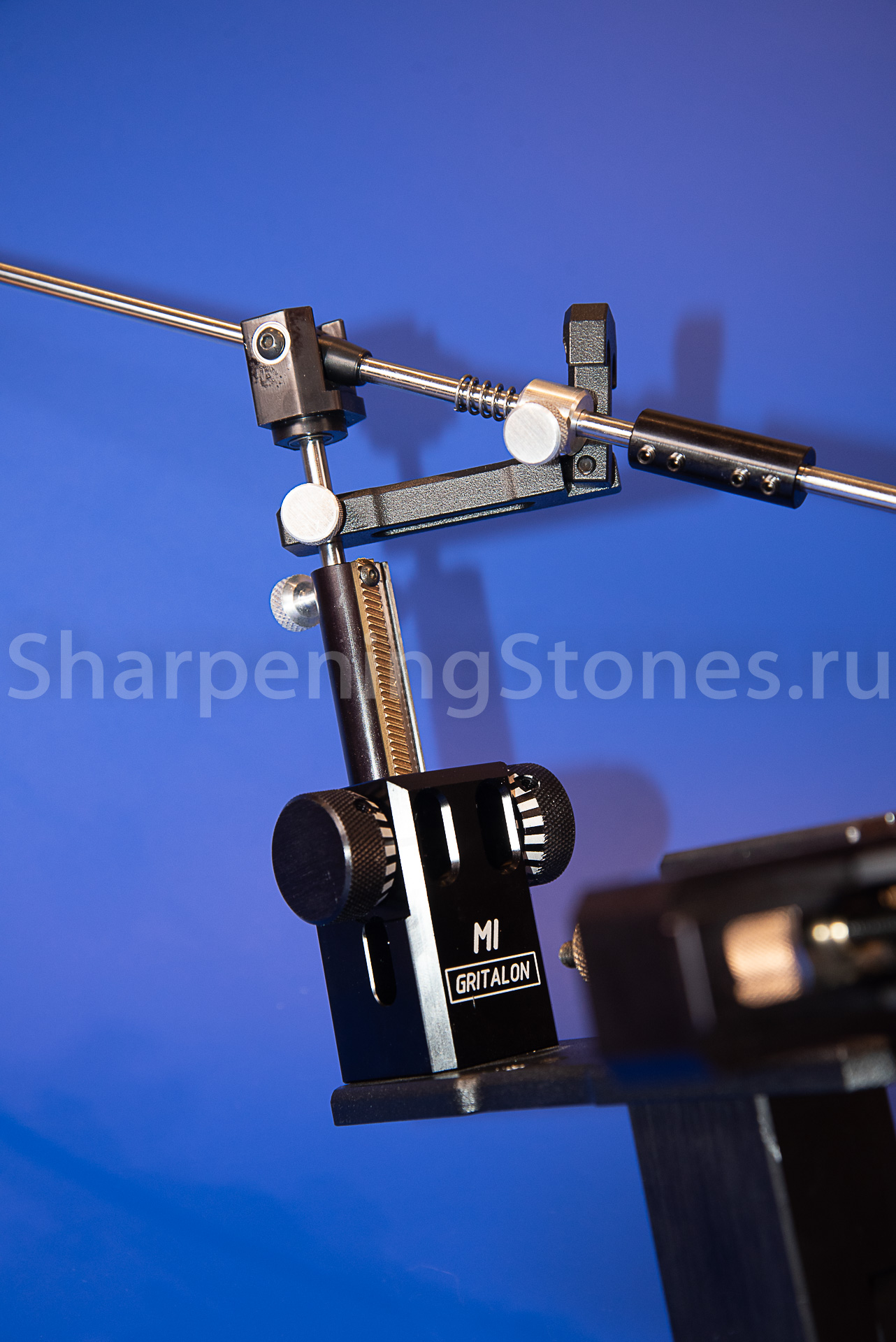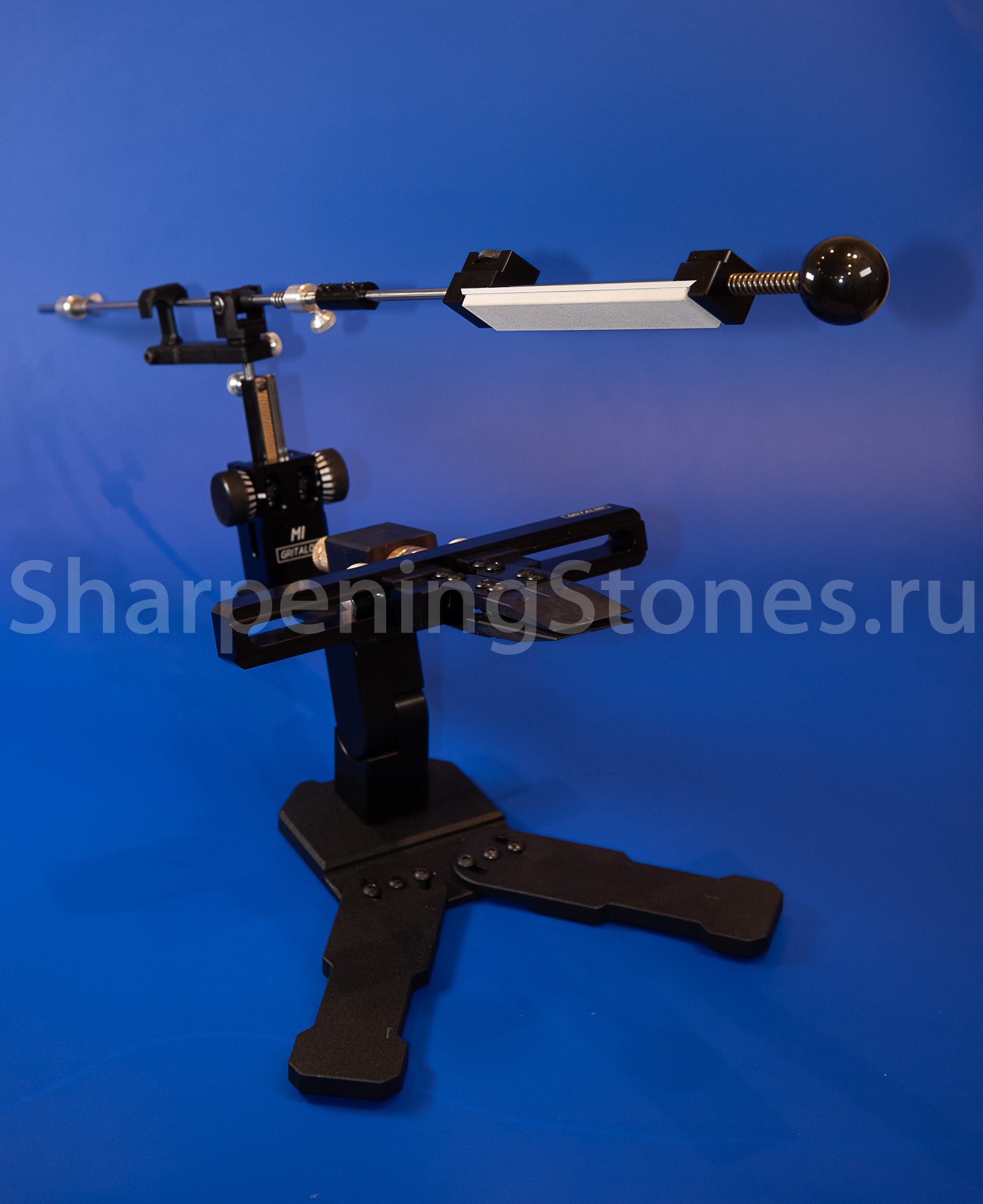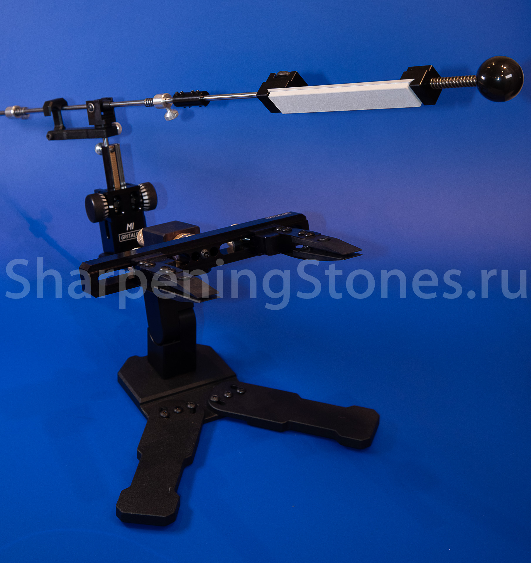 Версия GRITALON M1 с поворотным зажимом клинков, устойчивым основанием с регулировкой наклона заточного столика.